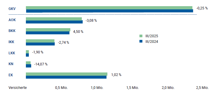 Die Anzahl der gesetzlich versicherten Brandenburger spielt eine wesentliche Rolle für die Höhe der MGV. Die Entwicklung im Vergleich zum Vorjahresquartal gestaltet sich in den einzelnen Kassenarten sehr unterschiedlich. Insgesamt ist die Anzahl der gesetzlich Versicherten im Land Brandenburg aktuell leider leicht rückläufig. Im Vergleich zum Vorjahr sank diese um 0,25 Prozent.