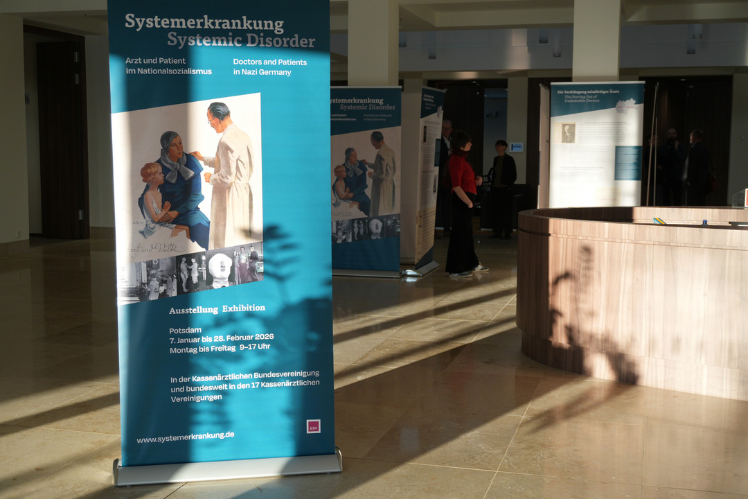 Die KVBB zeigt in ihrem Haus in Potsdam die Wanderausstellung „Systemerkrankung. Arzt und Patient im Nationalsozialismus“. Im Mittelpunkt stehen dabei die Ärzteschaft, Patienten und die Rolle der Kassenärztlichen Vereinigung Deutschlands (KVD) während des Nazi-Terrors zwischen 1933 und 1945.