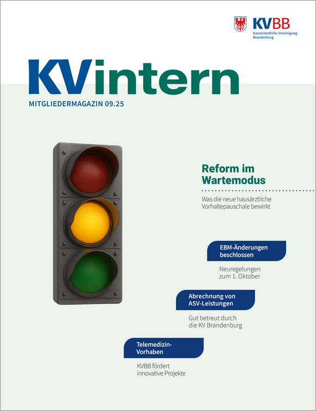 KV intern 09/2025Reform im Wartemodus: Was die neue hausärztliche Vorhaltepauschale bewirkt / EBM-Änderungen beschlossen: Neuregelungen zum 1. Oktober / Abrechnung von ASV-Leistungen: Gut betreut durch die KV Brandenburg / Telemedizin-Vorhaben: KVBB fördert innovative Projekte